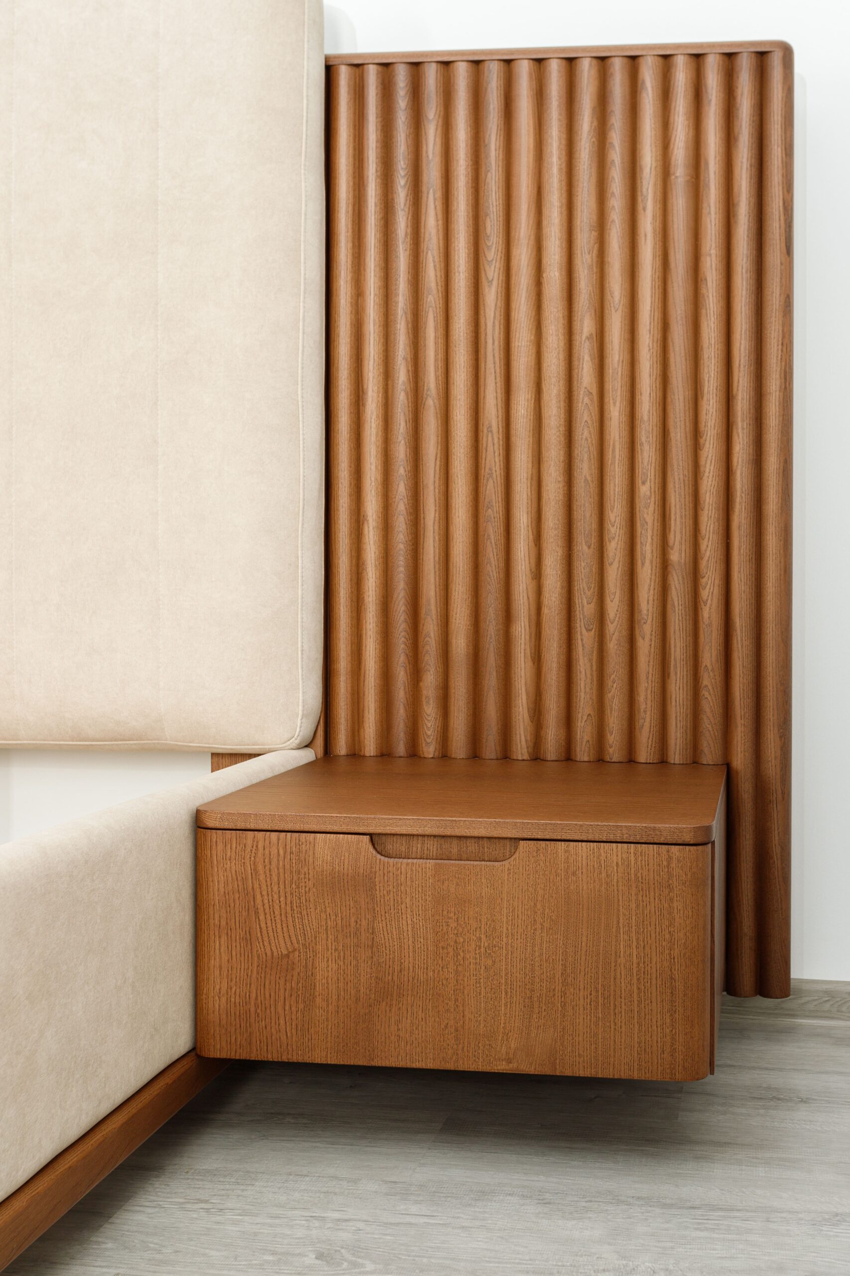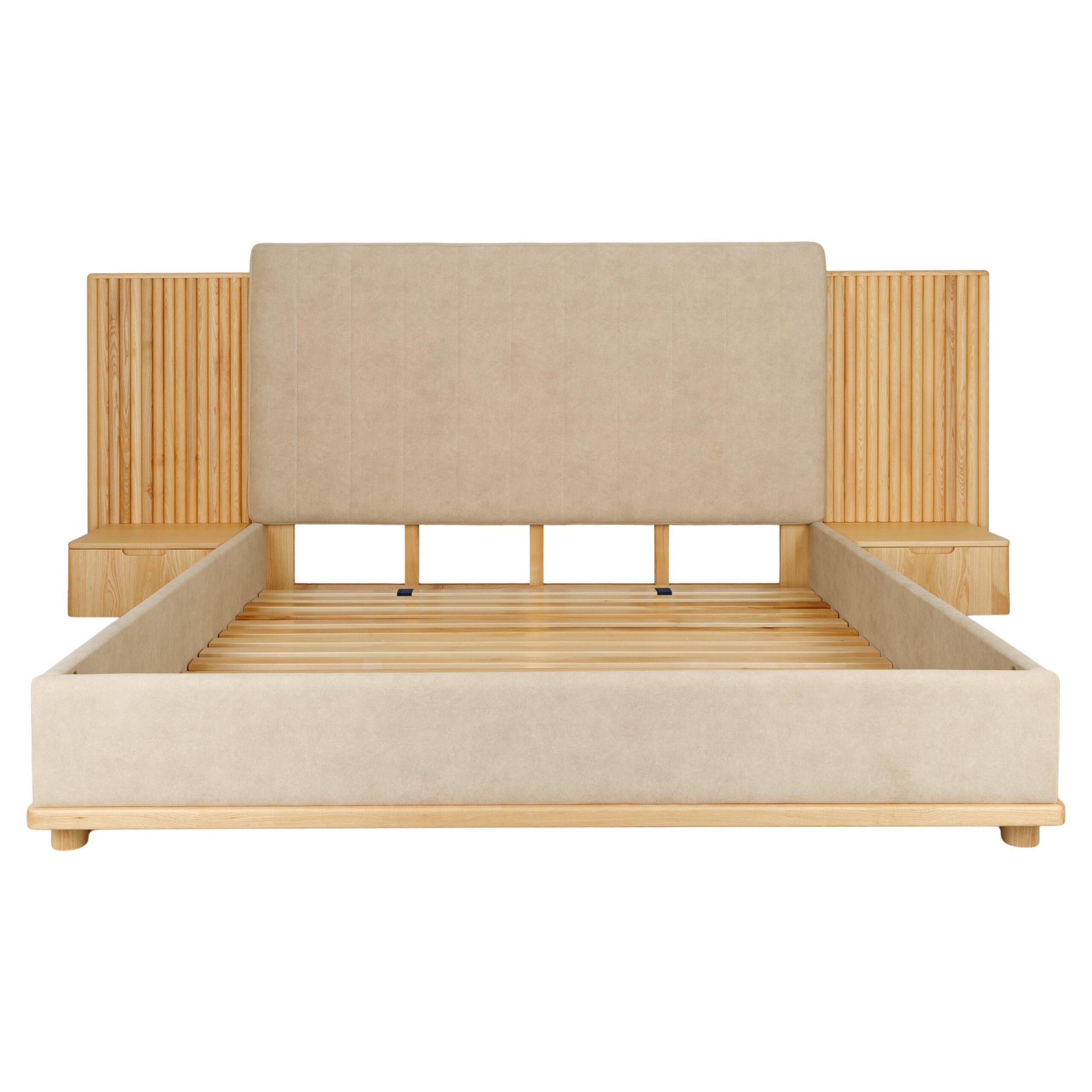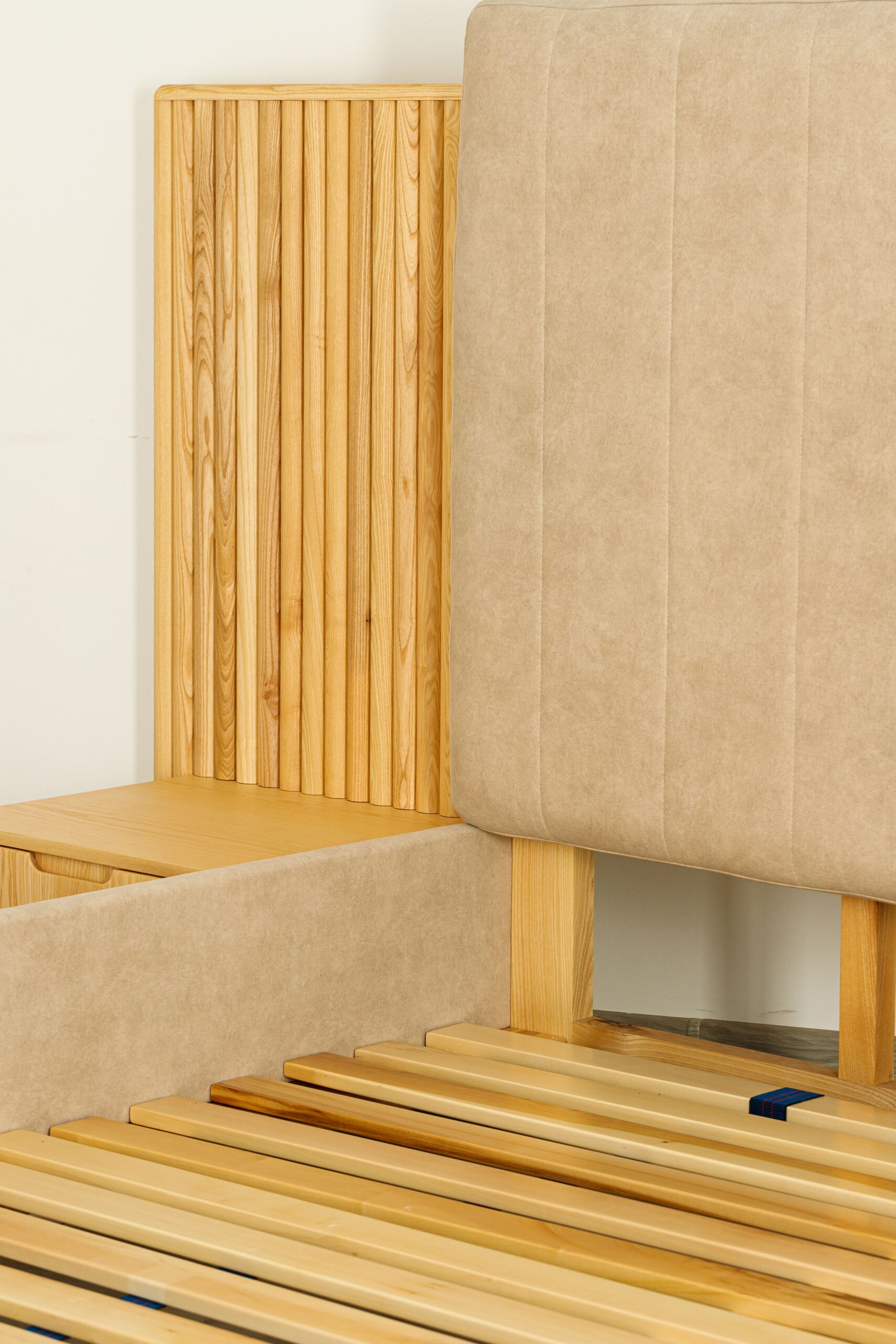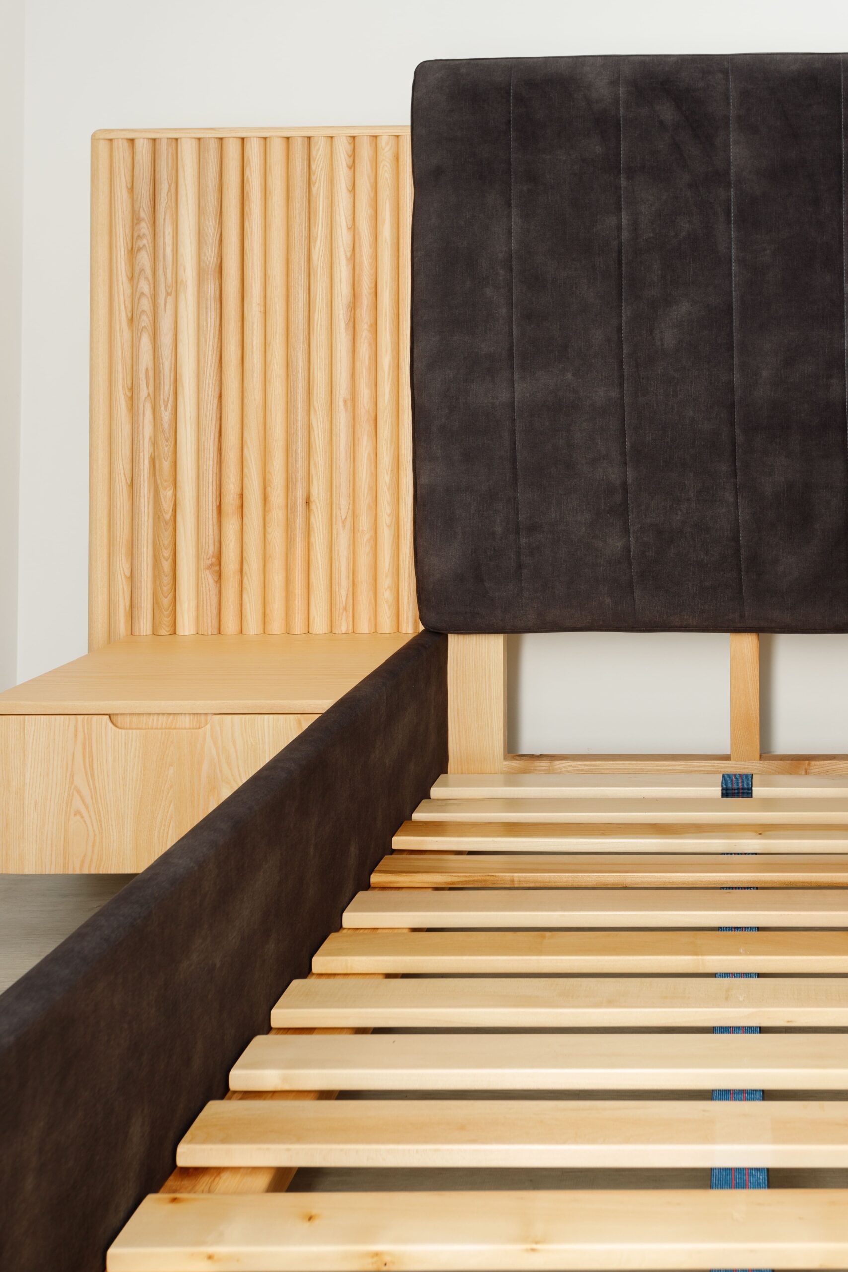 Collection de lits au design architectural, associant bois frêne massif et finitions textiles haut de gamme.