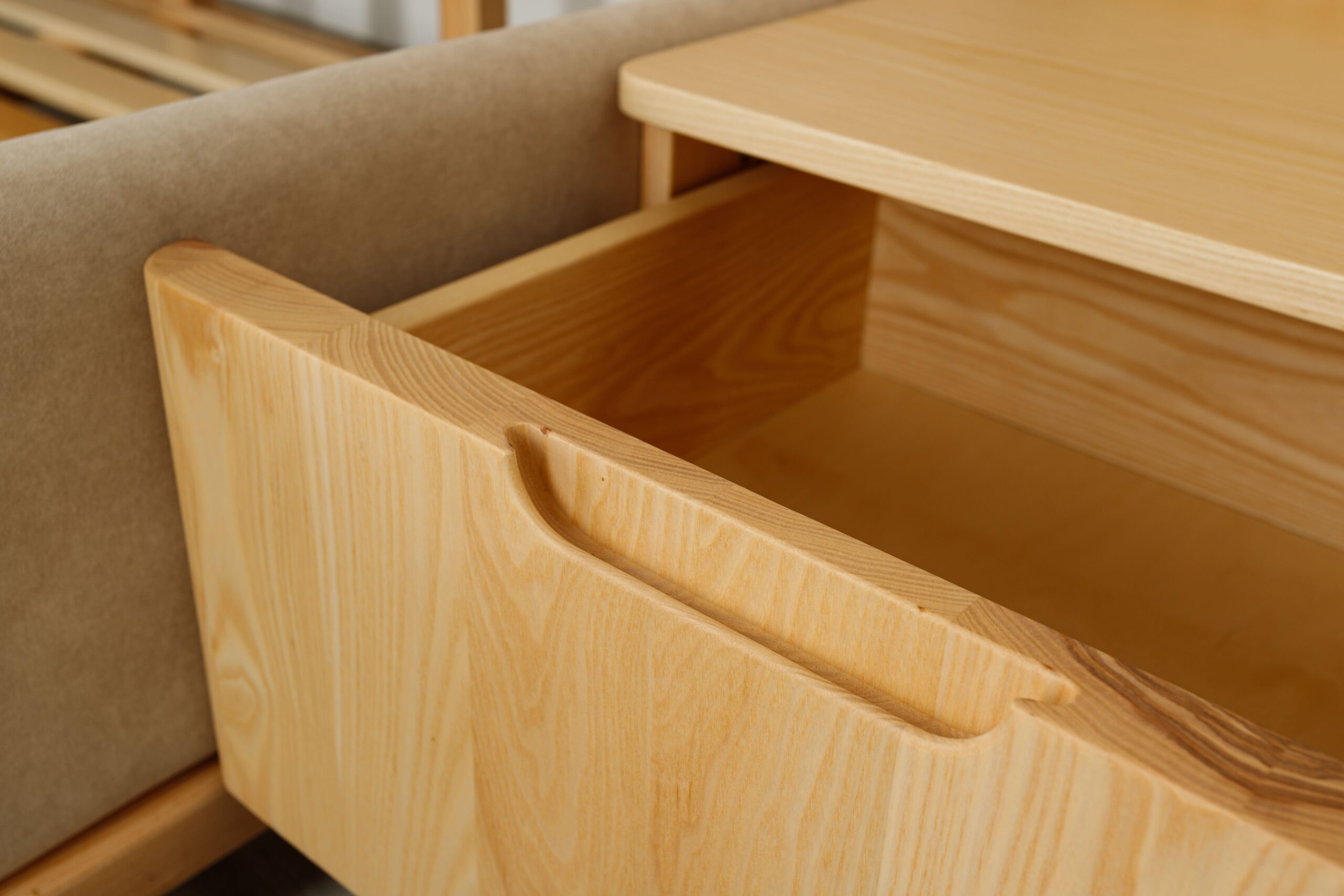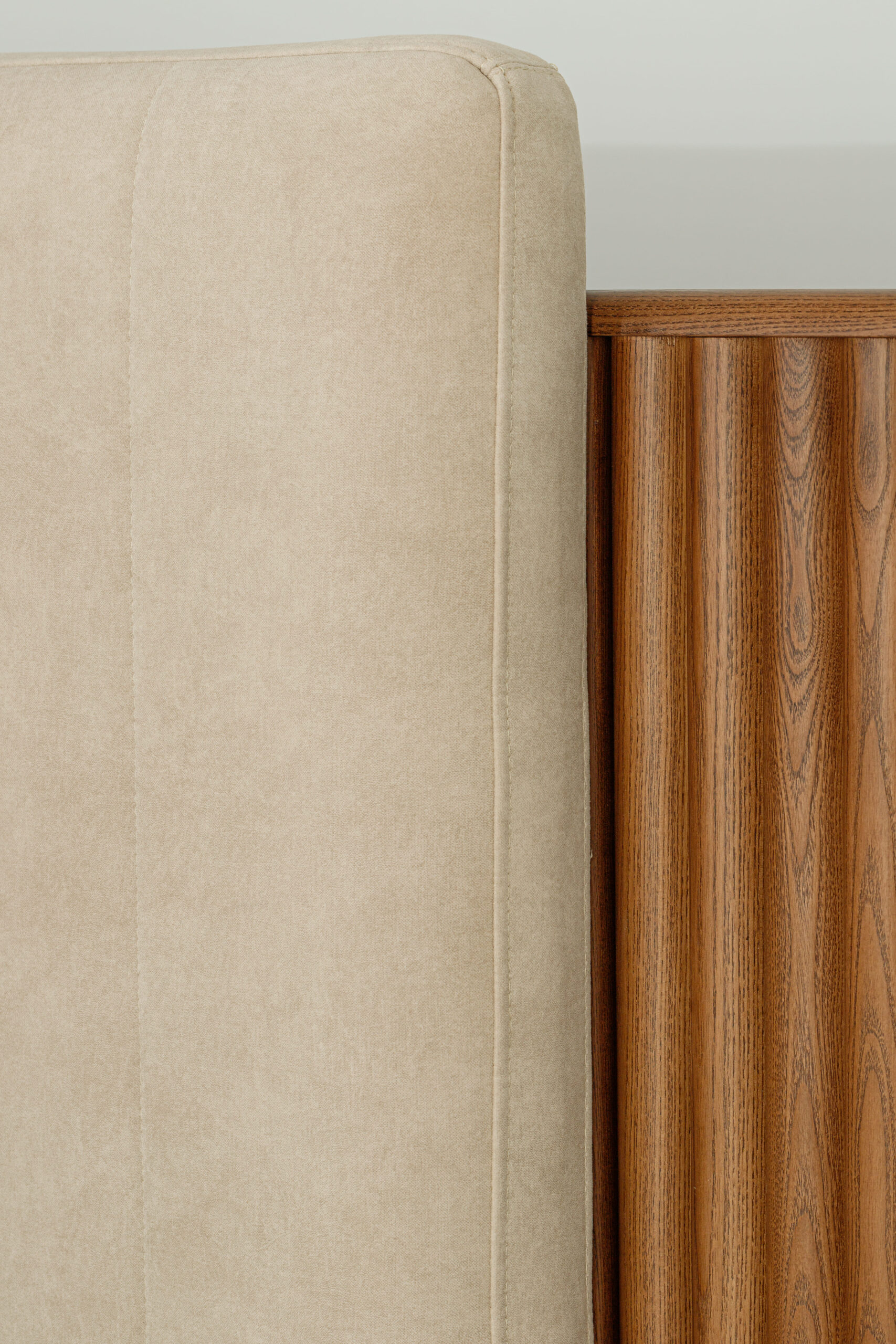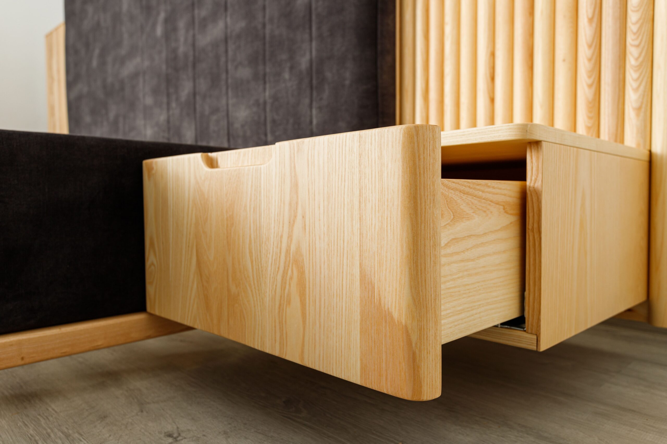 Collection de lits au design architectural, associant bois frêne massif et finitions textiles haut de gamme.
