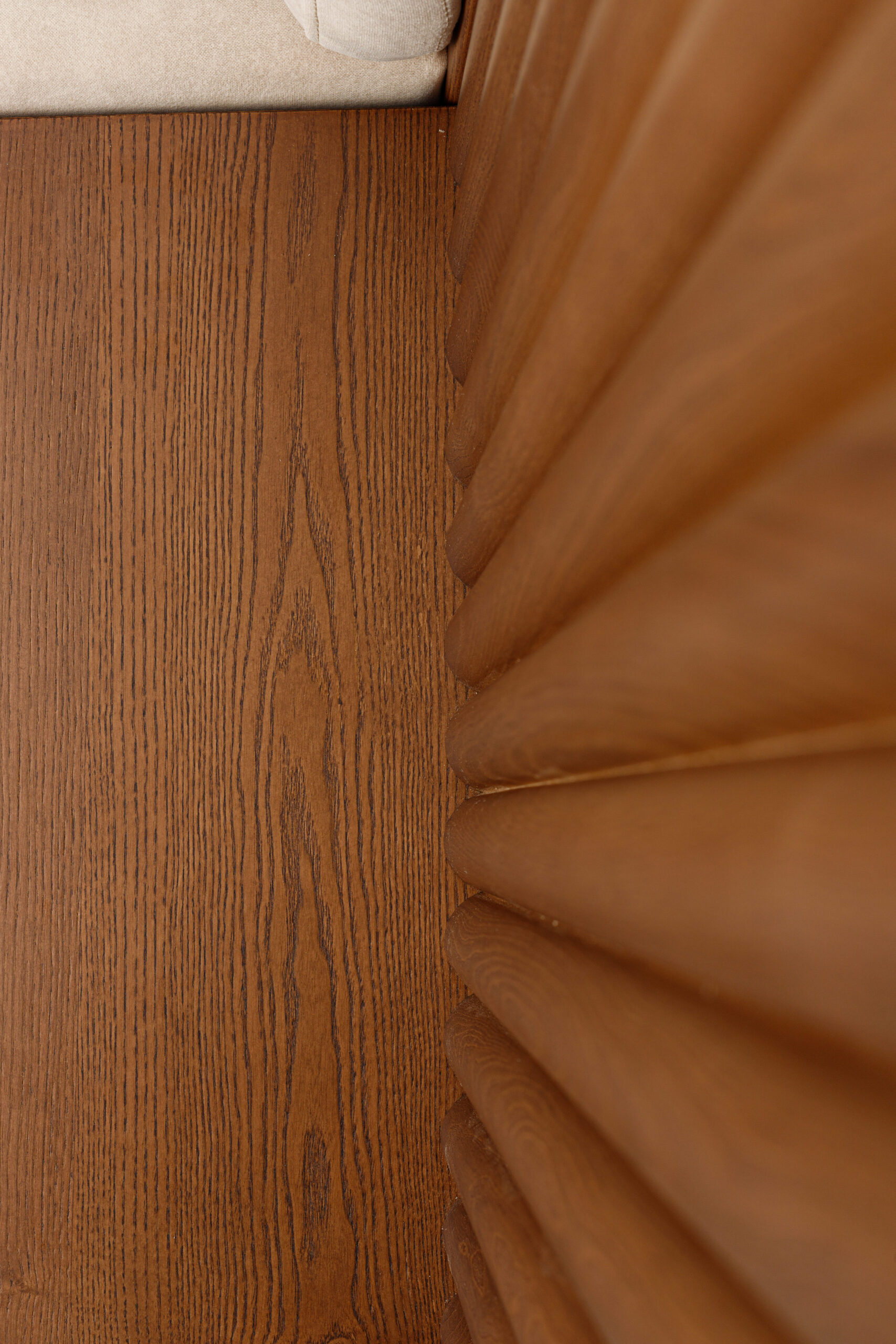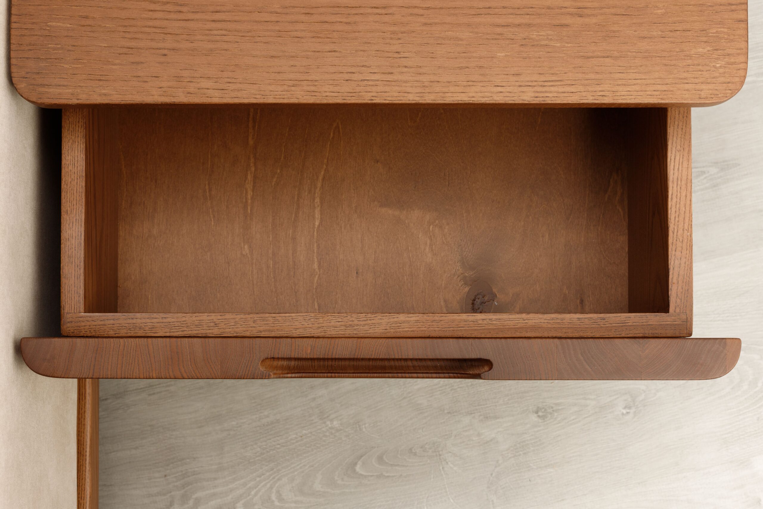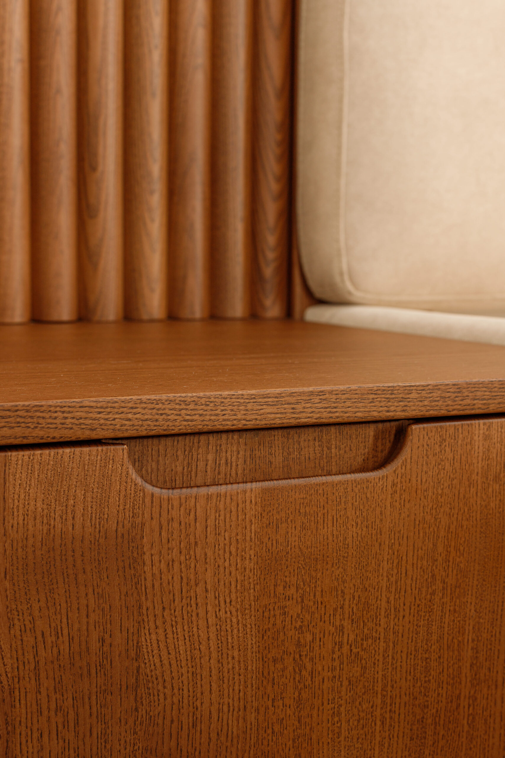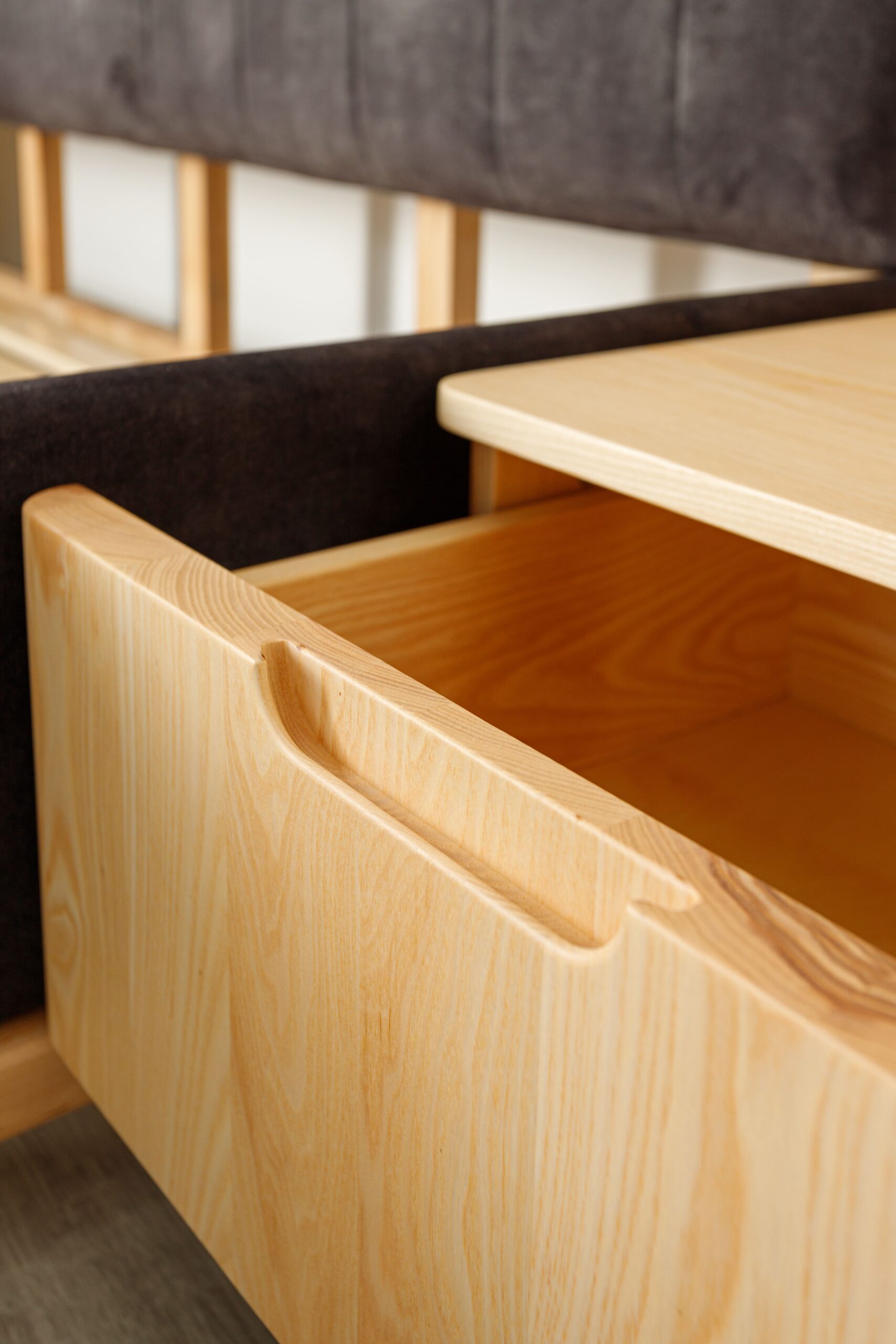 Collection de lits au design architectural, associant bois frêne massif et finitions textiles haut de gamme.