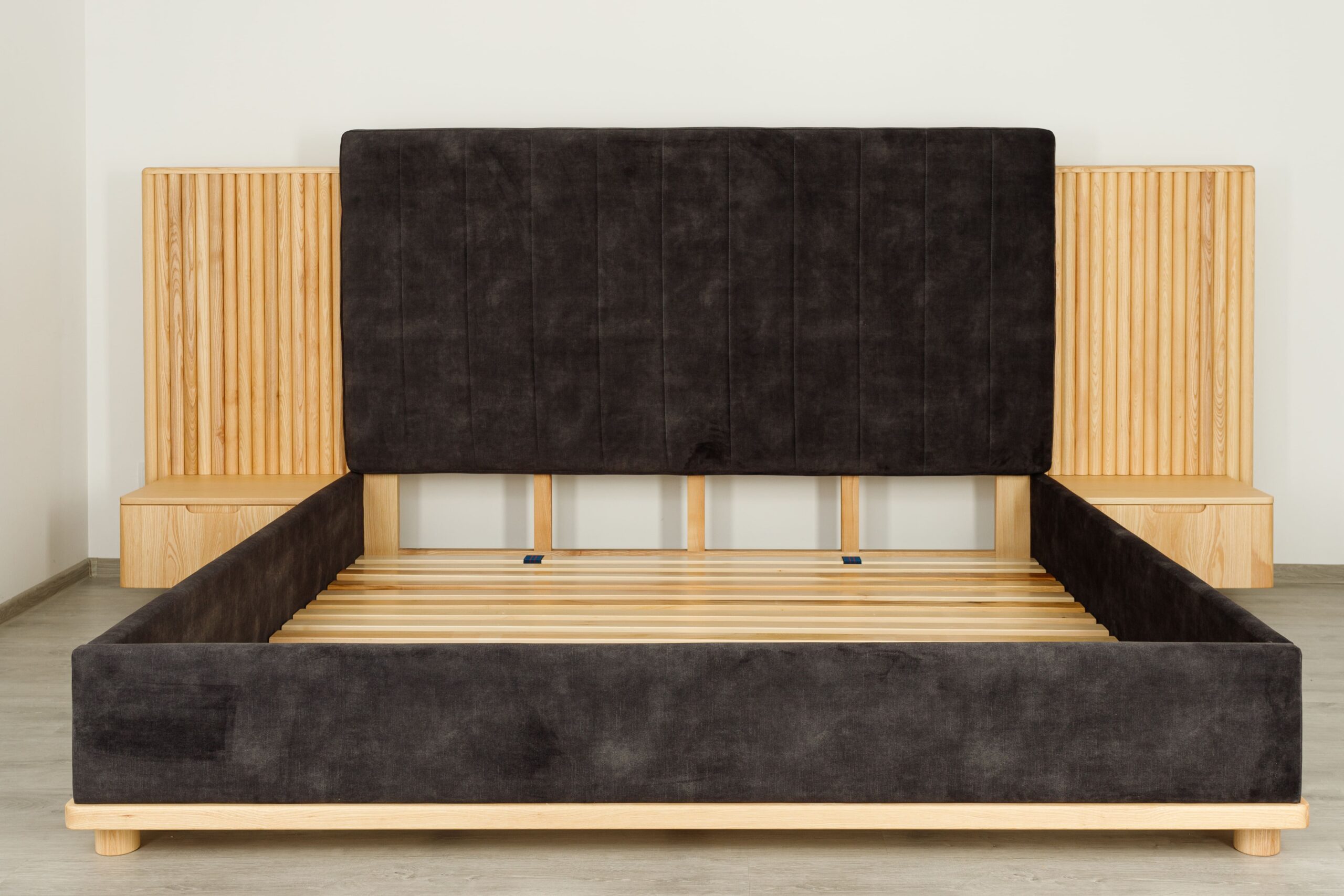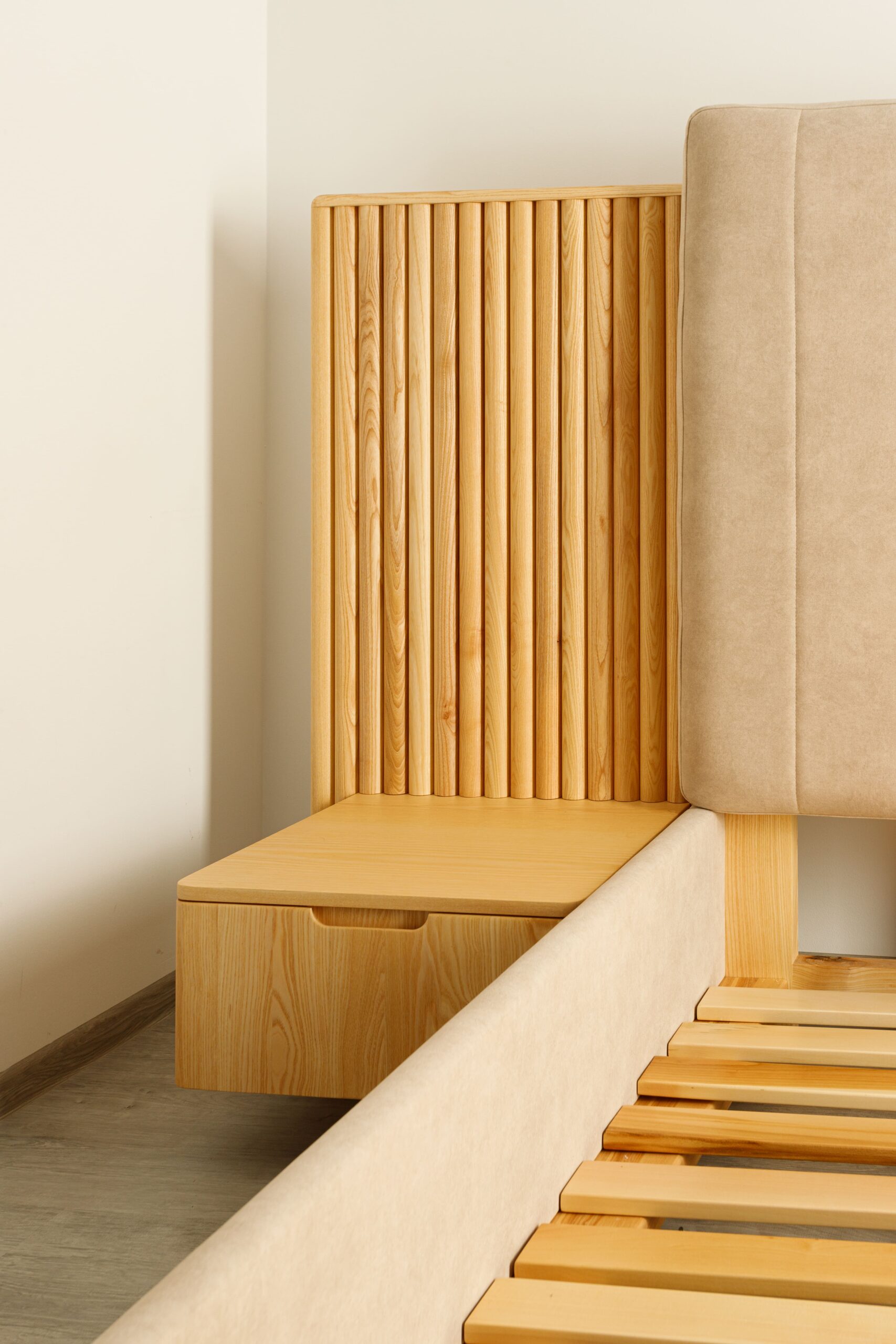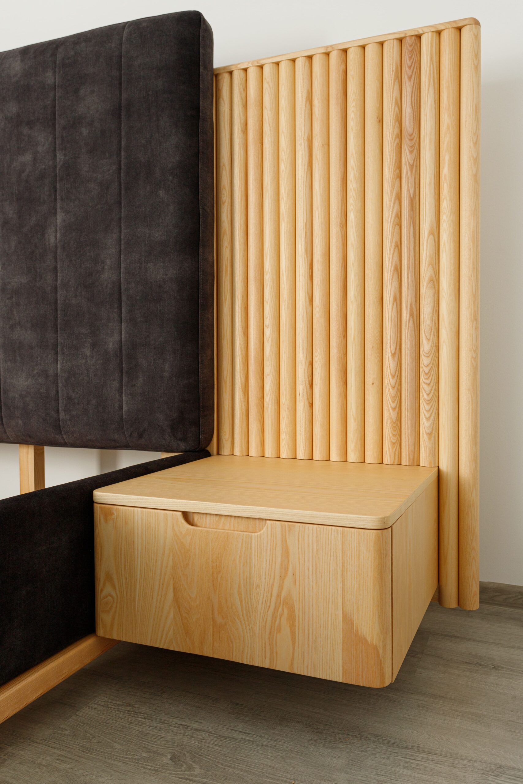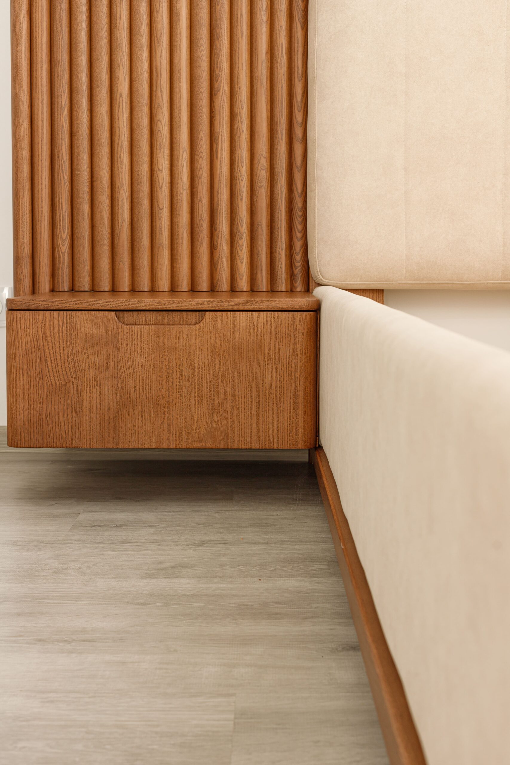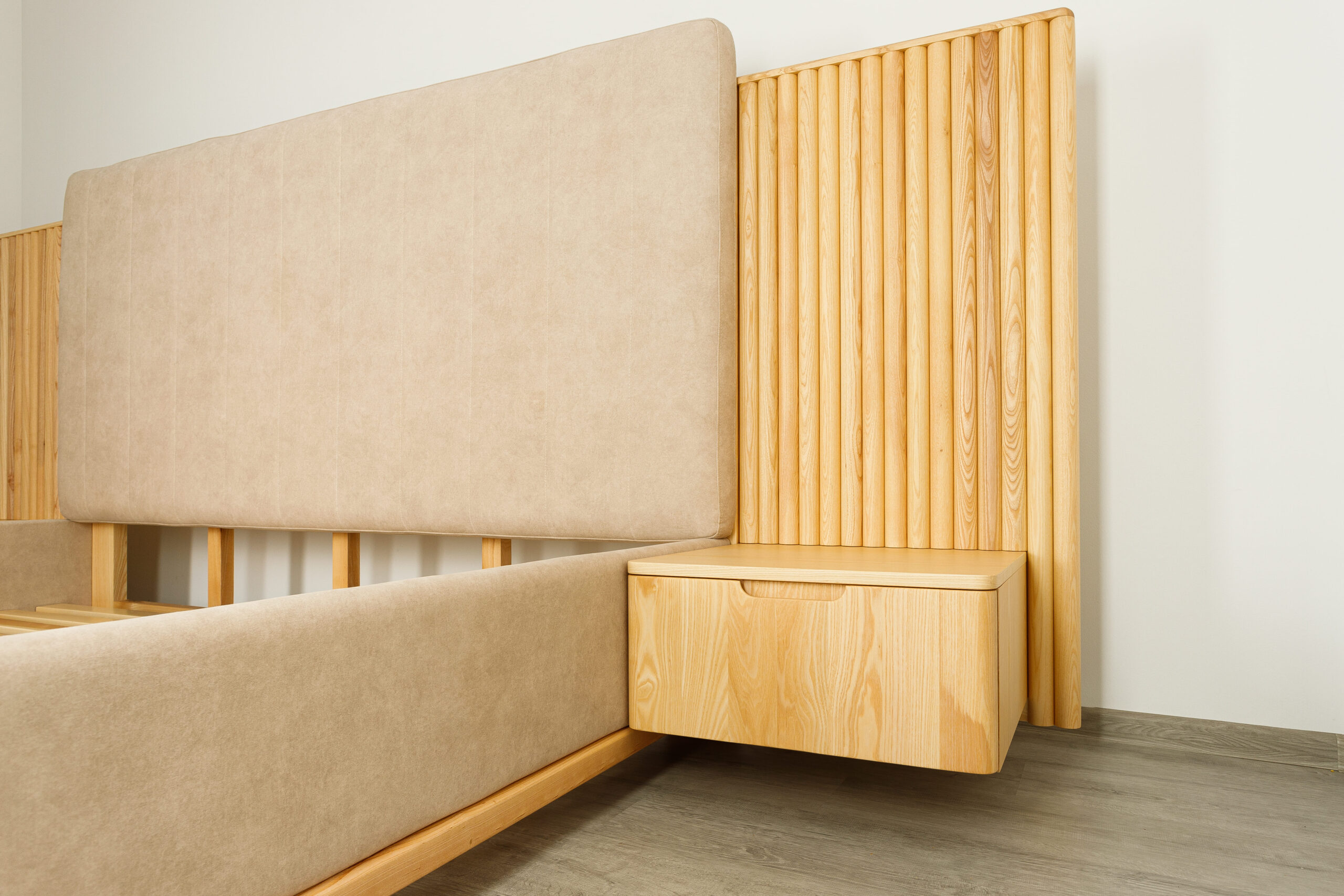 La tête de lit se distingue par ses panneaux latéraux en tasseaux verticaux intégrant des chevets suspendus avec tiroirs, formant un ensemble structuré, harmonieux et fonctionnel.