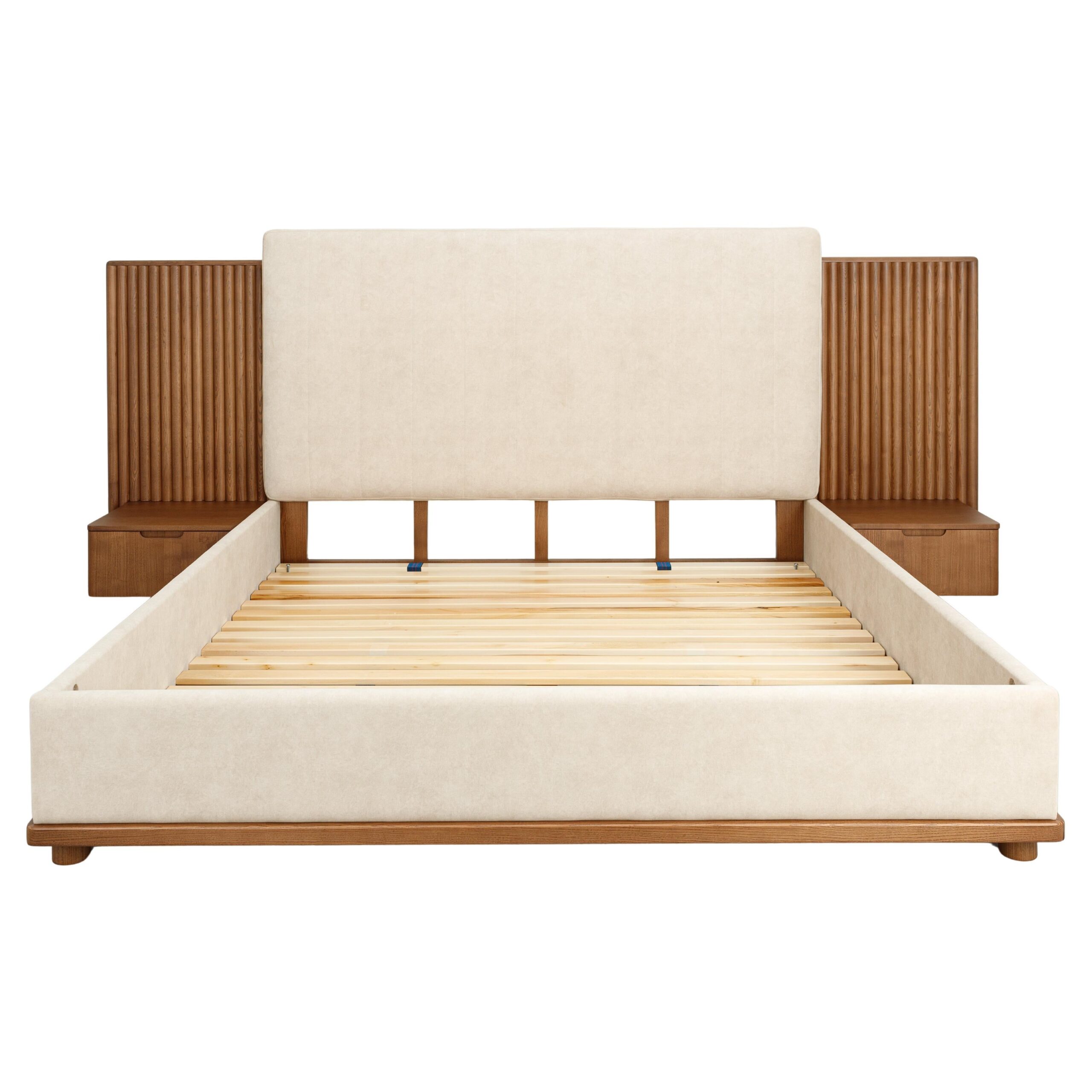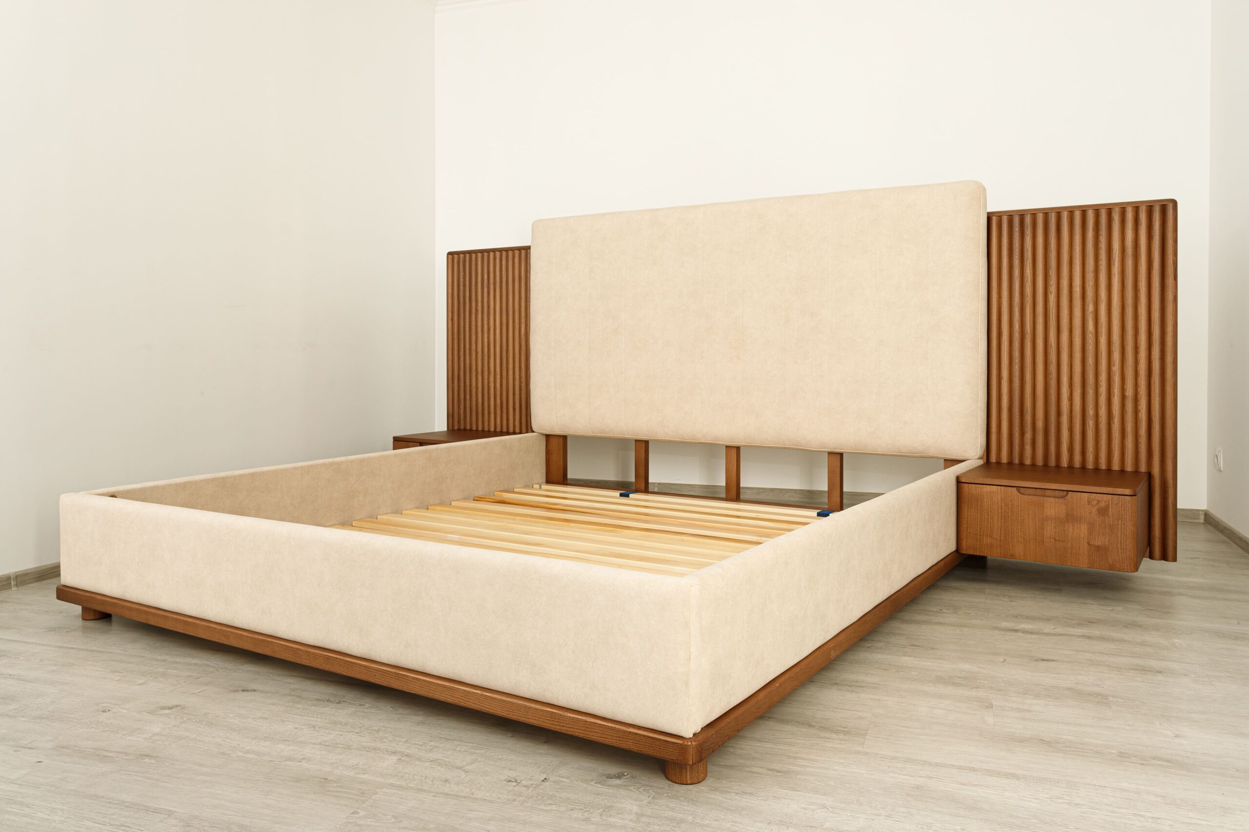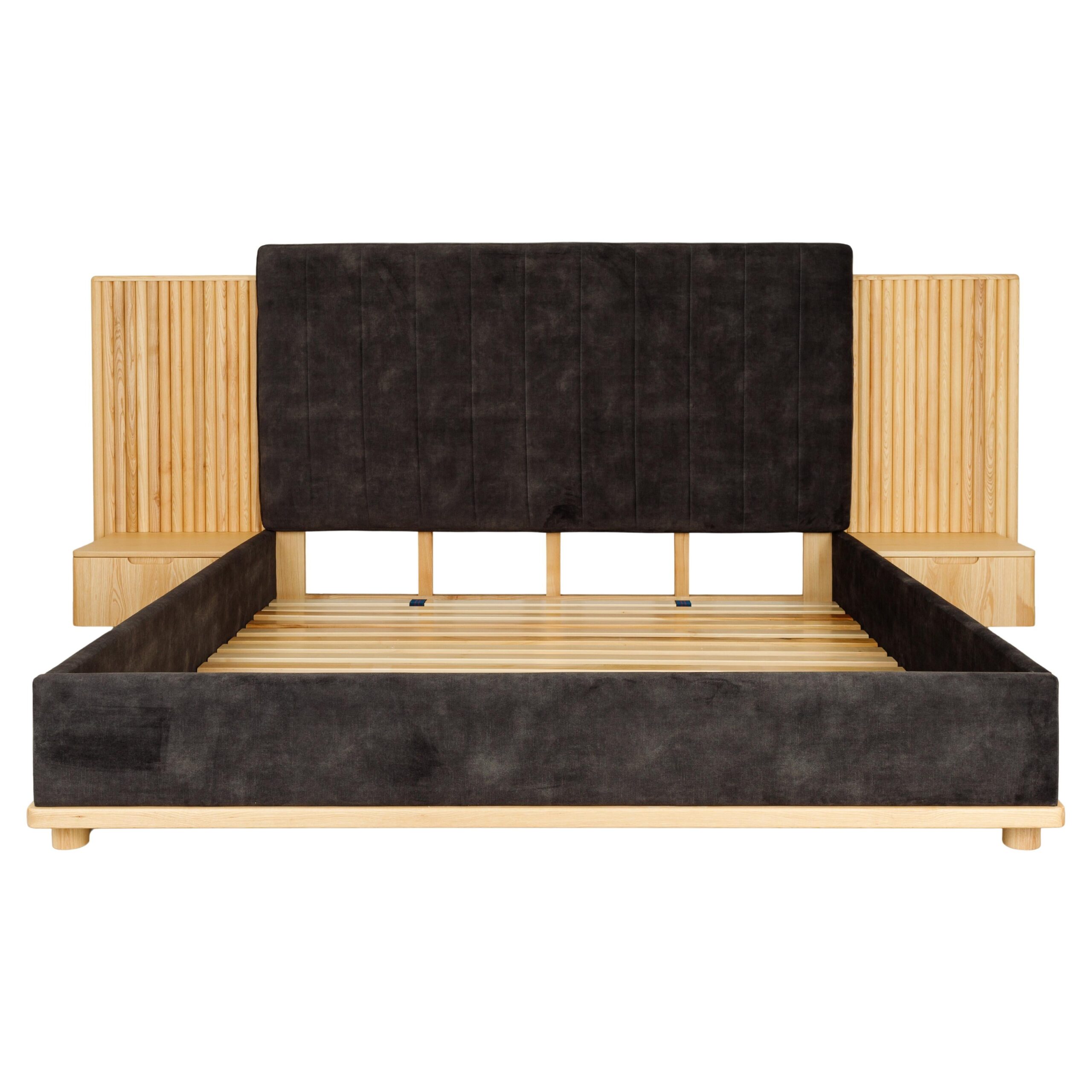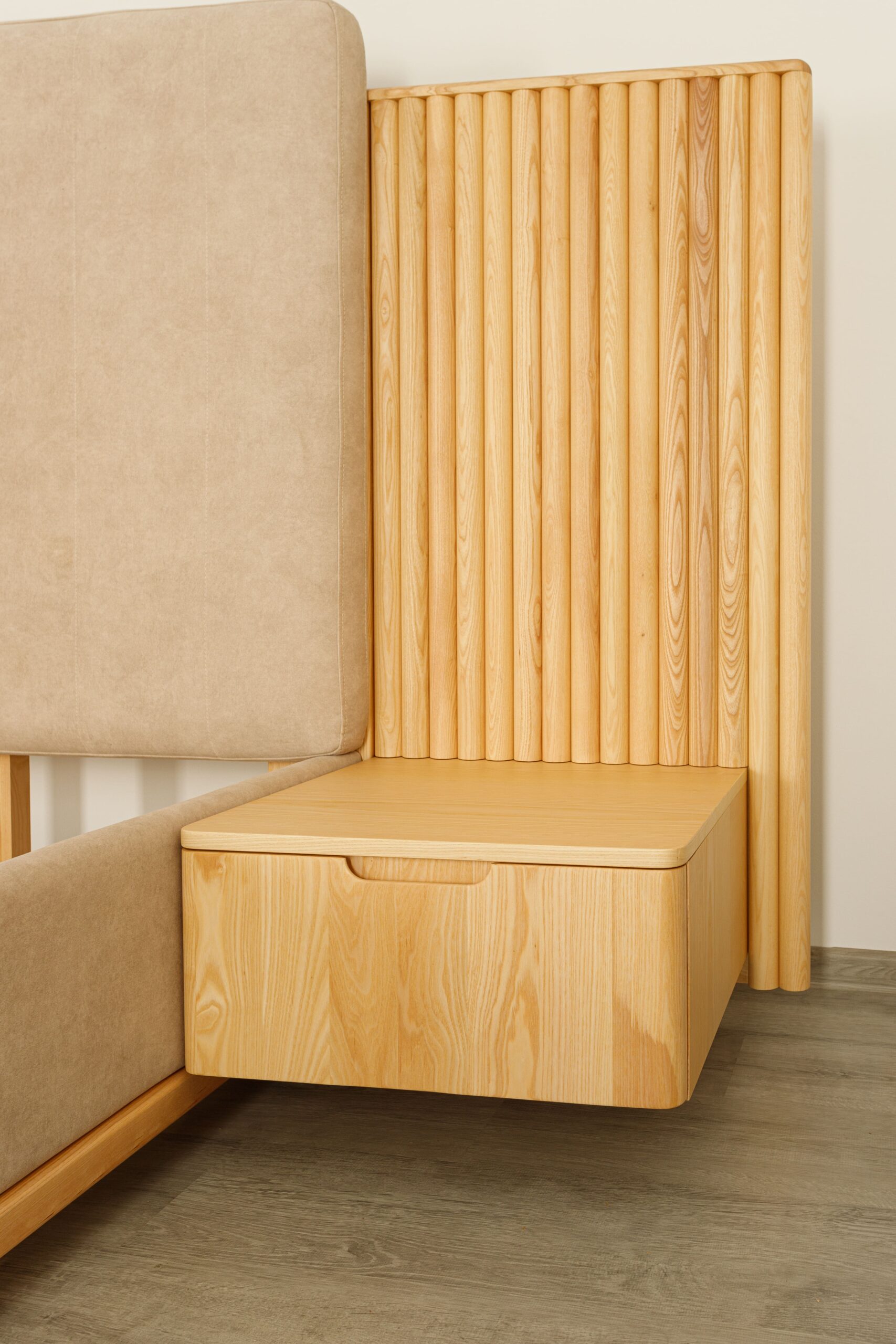 La tête de lit se distingue par ses panneaux latéraux en tasseaux verticaux intégrant des chevets suspendus avec tiroirs, formant un ensemble structuré, harmonieux et fonctionnel.