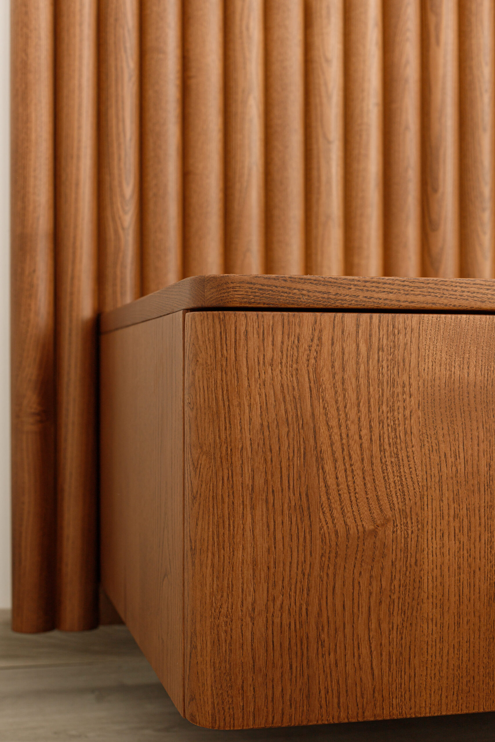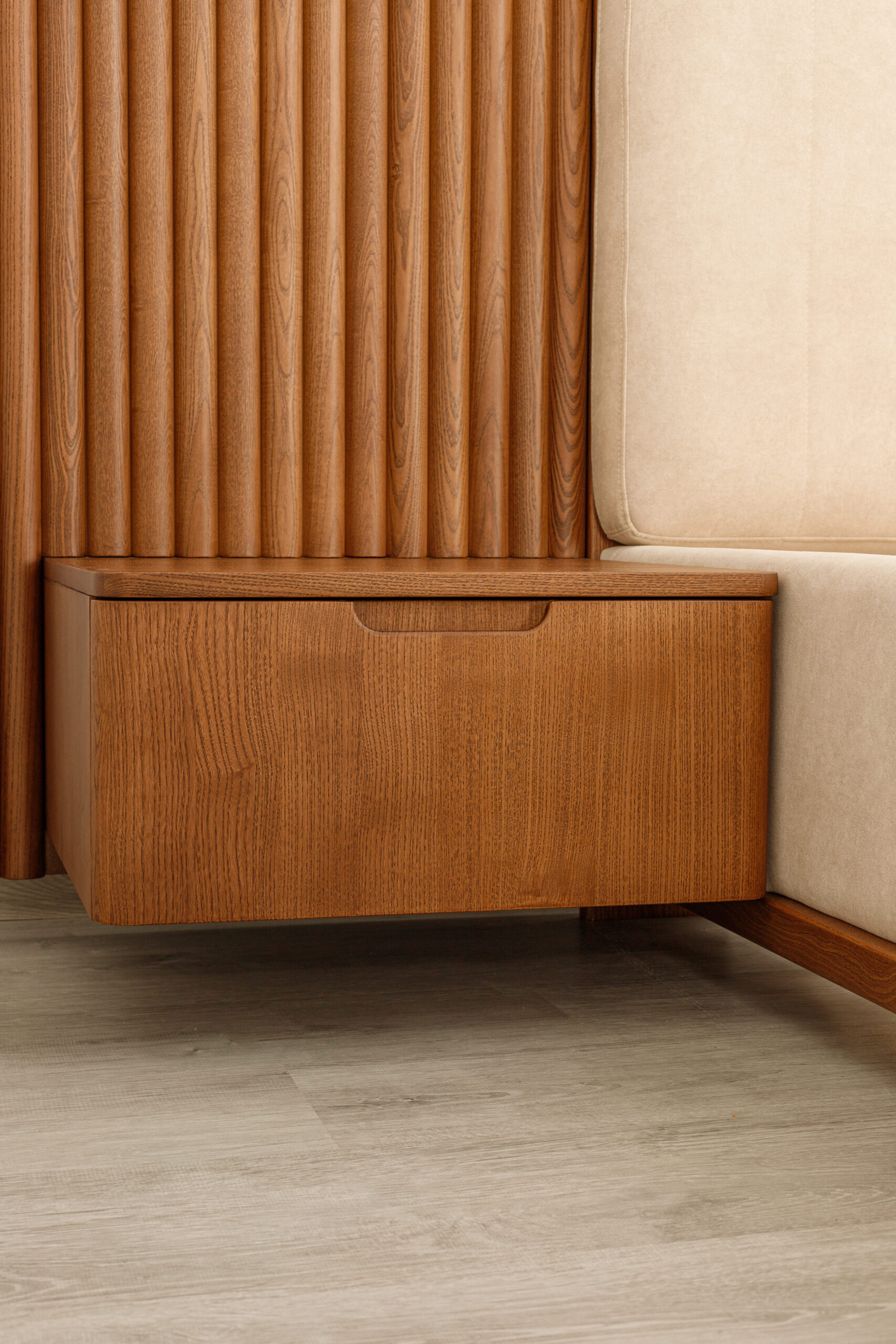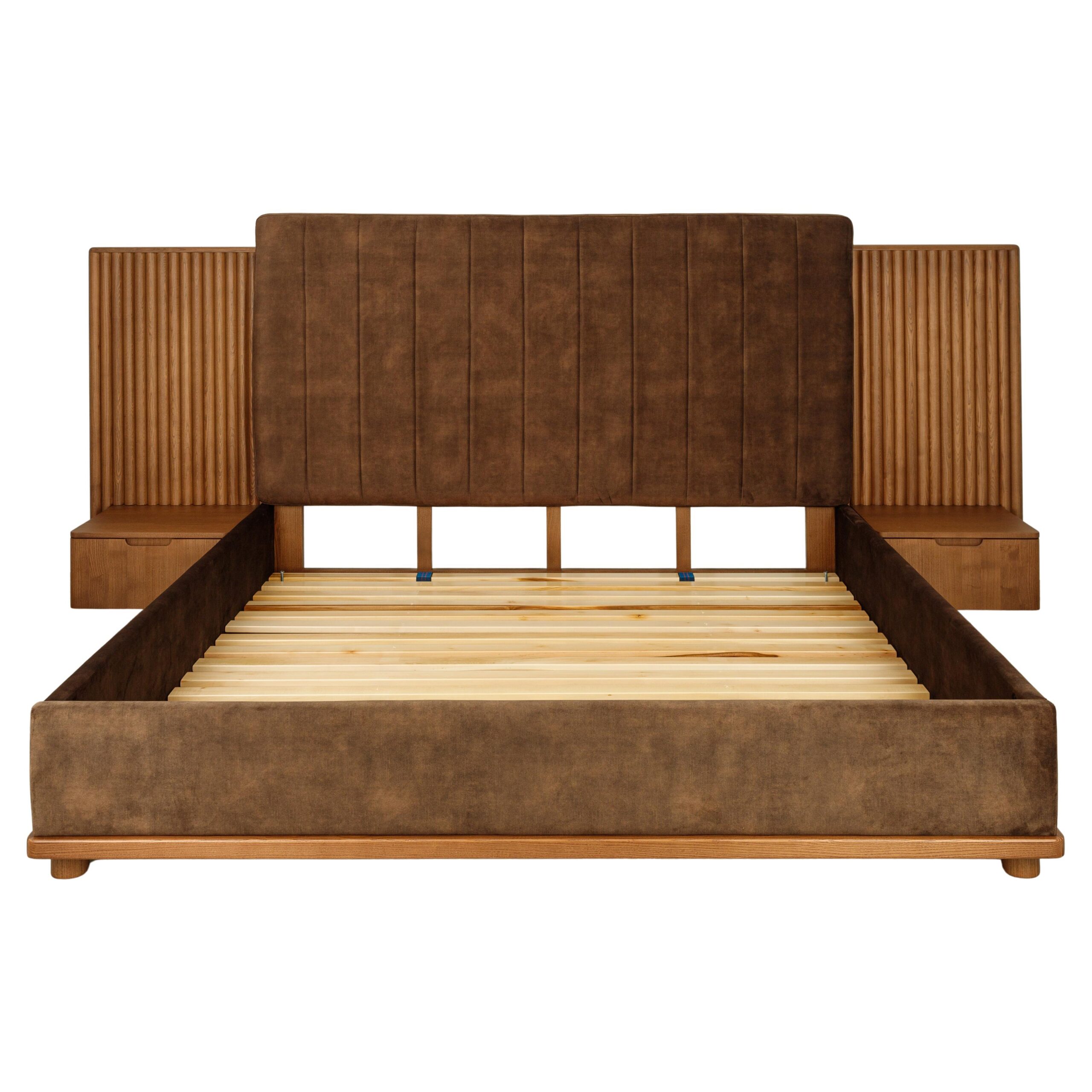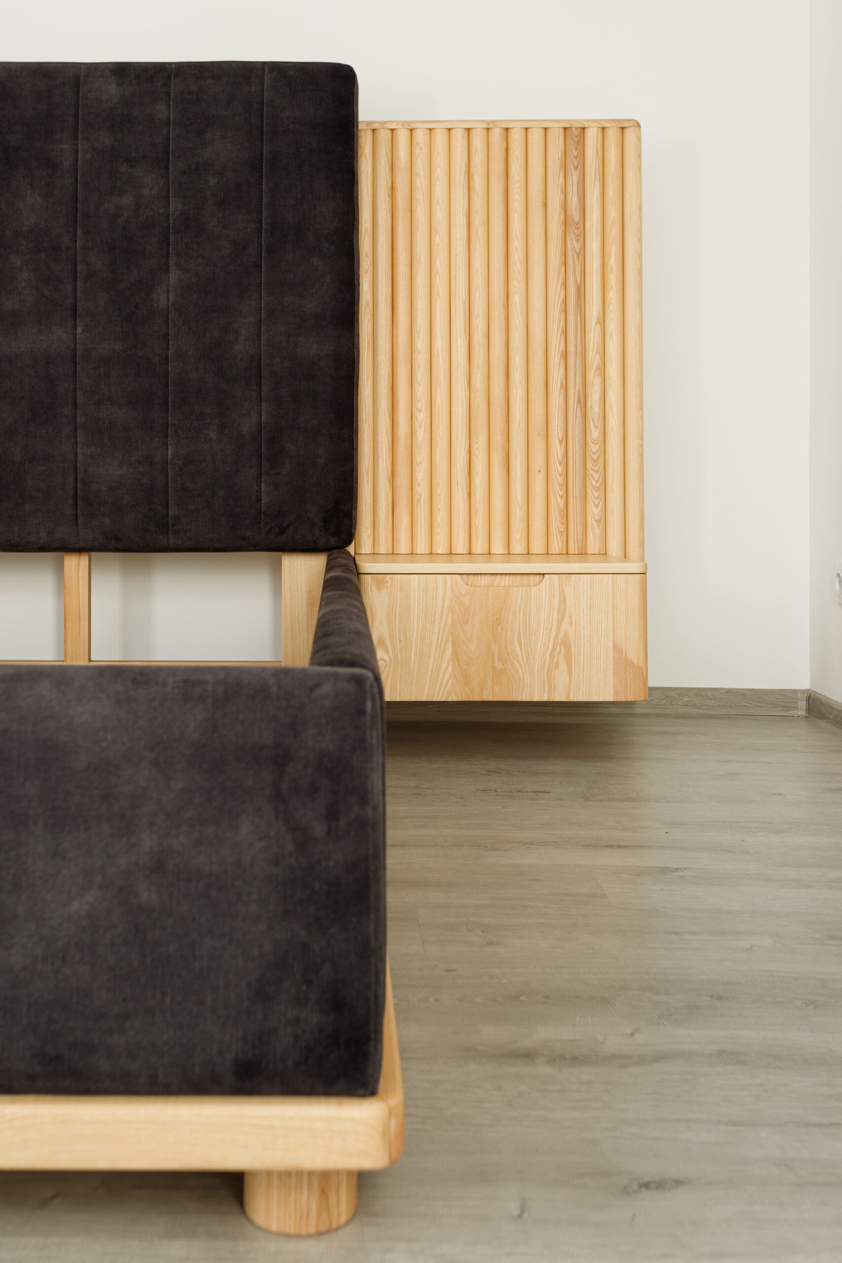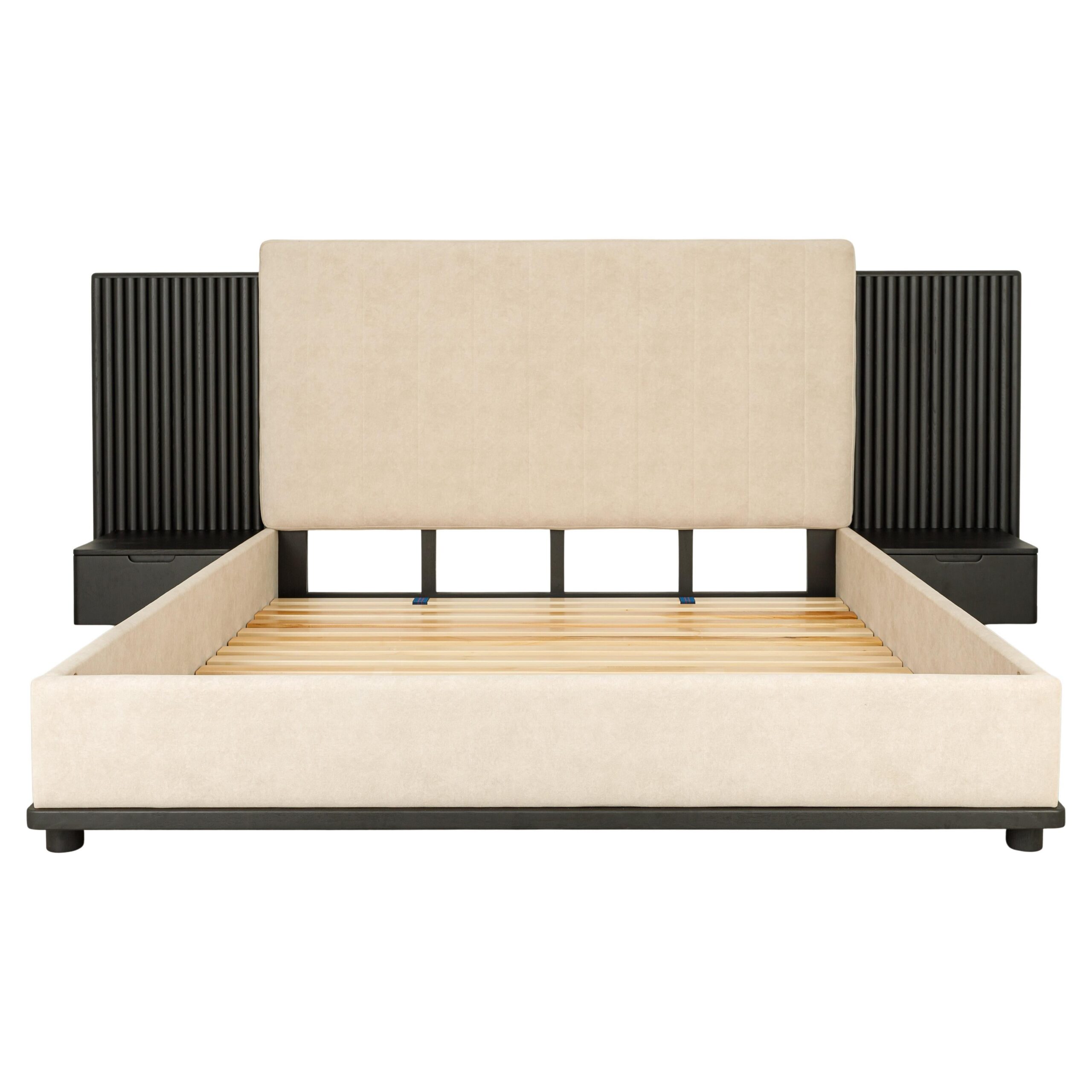 La tête de lit se distingue par ses panneaux latéraux en tasseaux verticaux intégrant des chevets suspendus avec tiroirs, formant un ensemble structuré, harmonieux et fonctionnel.