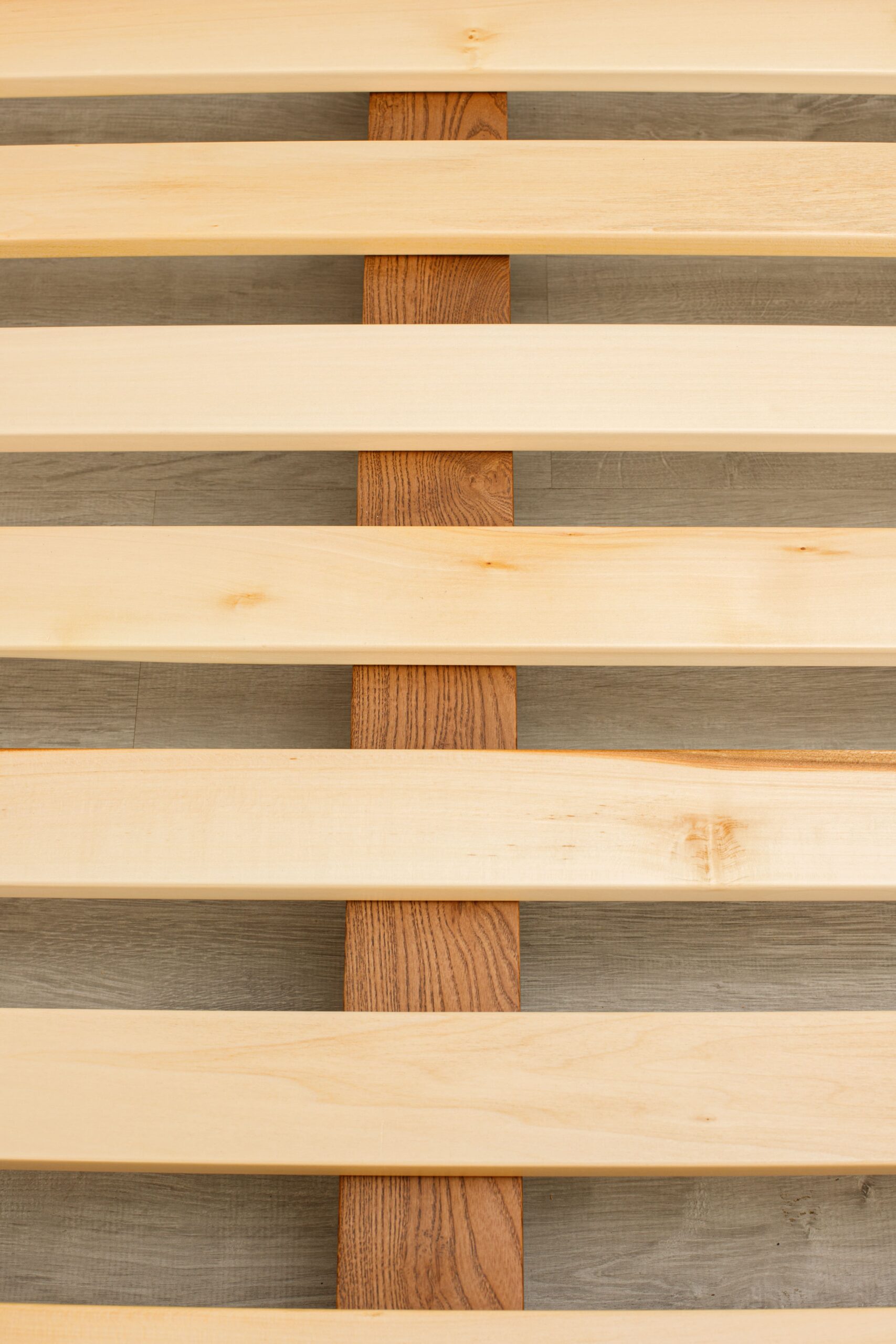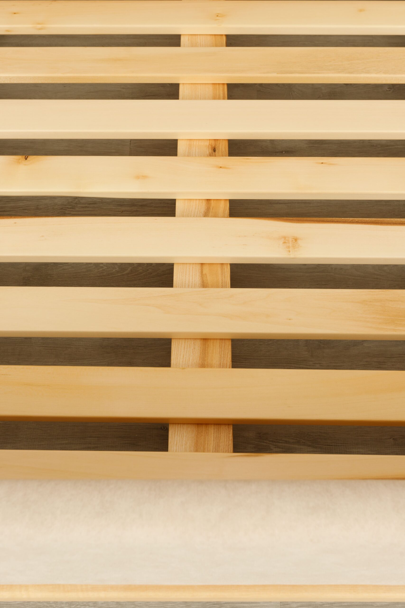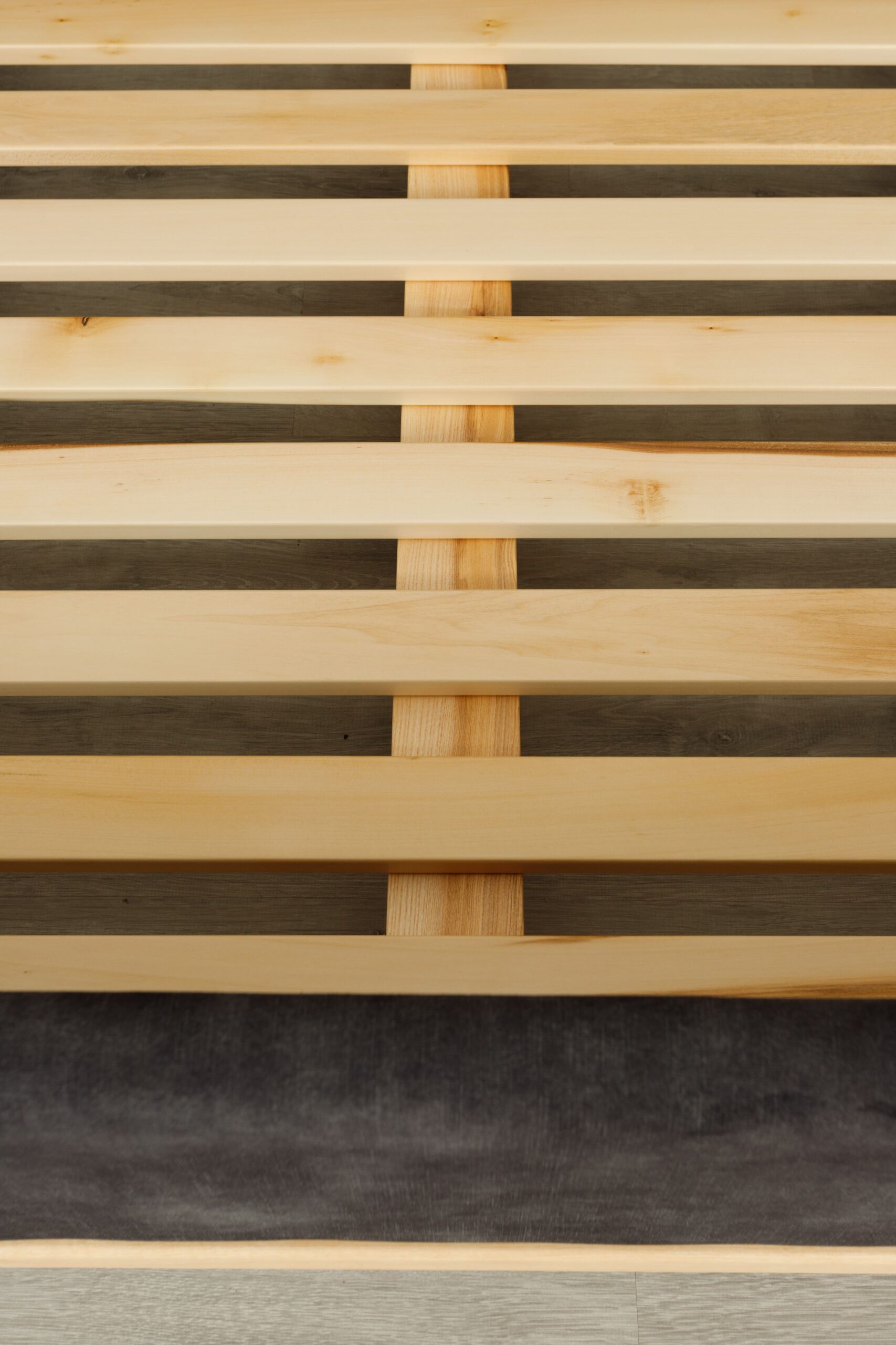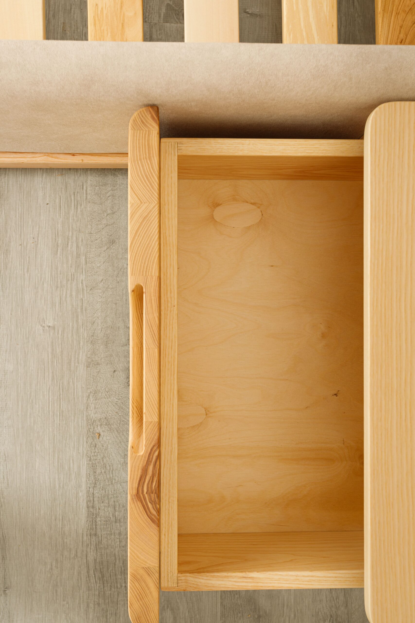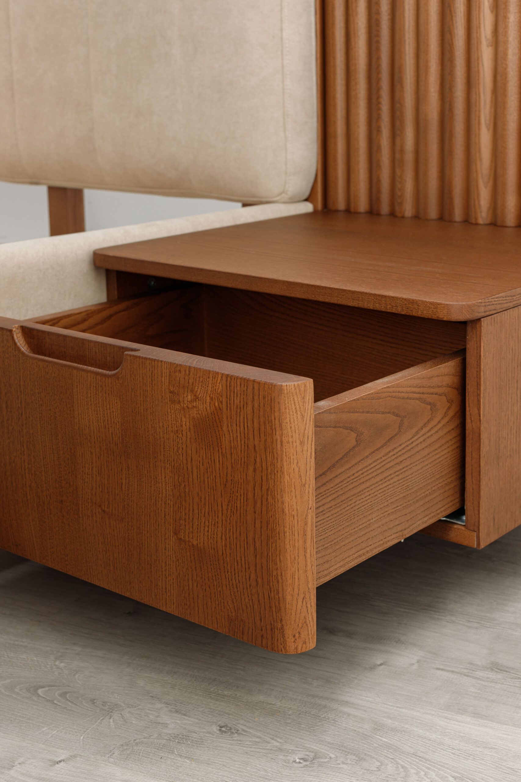 La tête de lit se distingue par ses panneaux latéraux en tasseaux verticaux intégrant des chevets suspendus avec tiroirs, formant un ensemble structuré, harmonieux et fonctionnel.